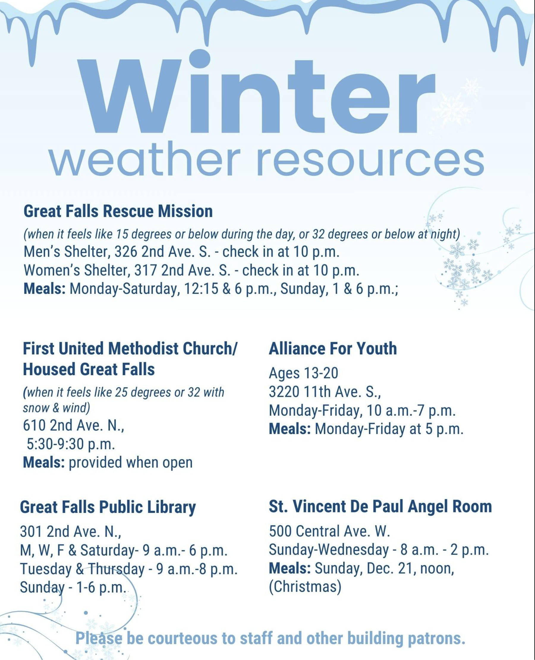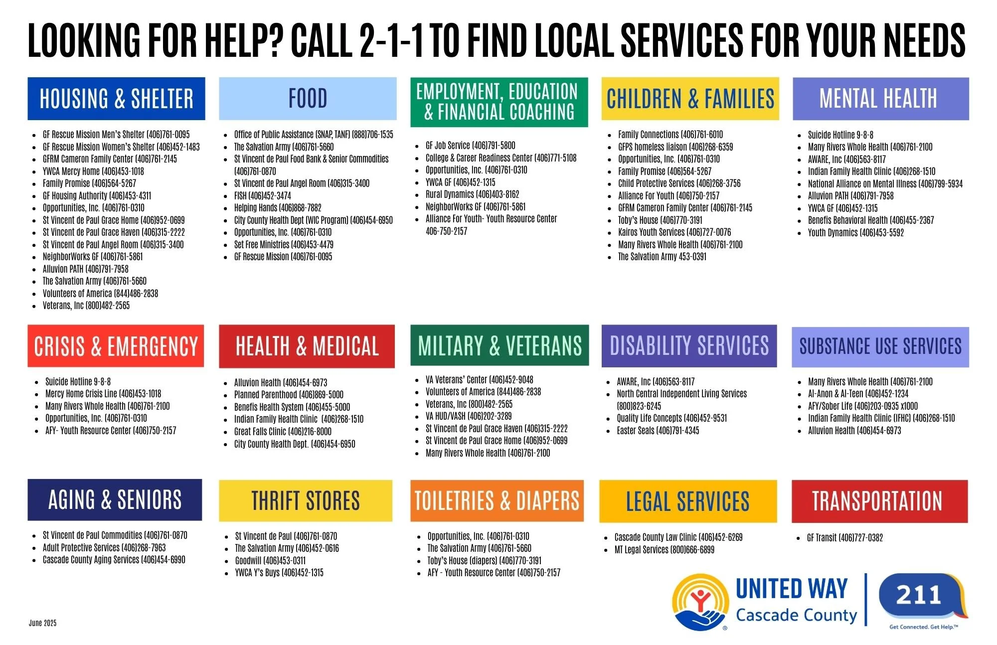 Salvation Army of Great Falls, 1000 17th Avenue South, open Monday through Friday 9a-4p. Pantry access one time per month per household. Meal assistance available